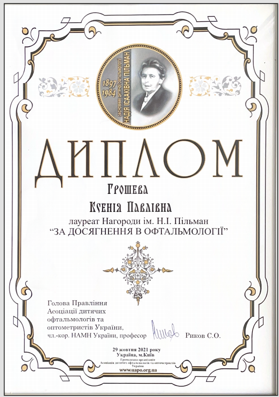 - 2021 — Лауреат нагороди ім. Н. І. Пільман «За досягнення в офтальмології», м. Київ, Україна