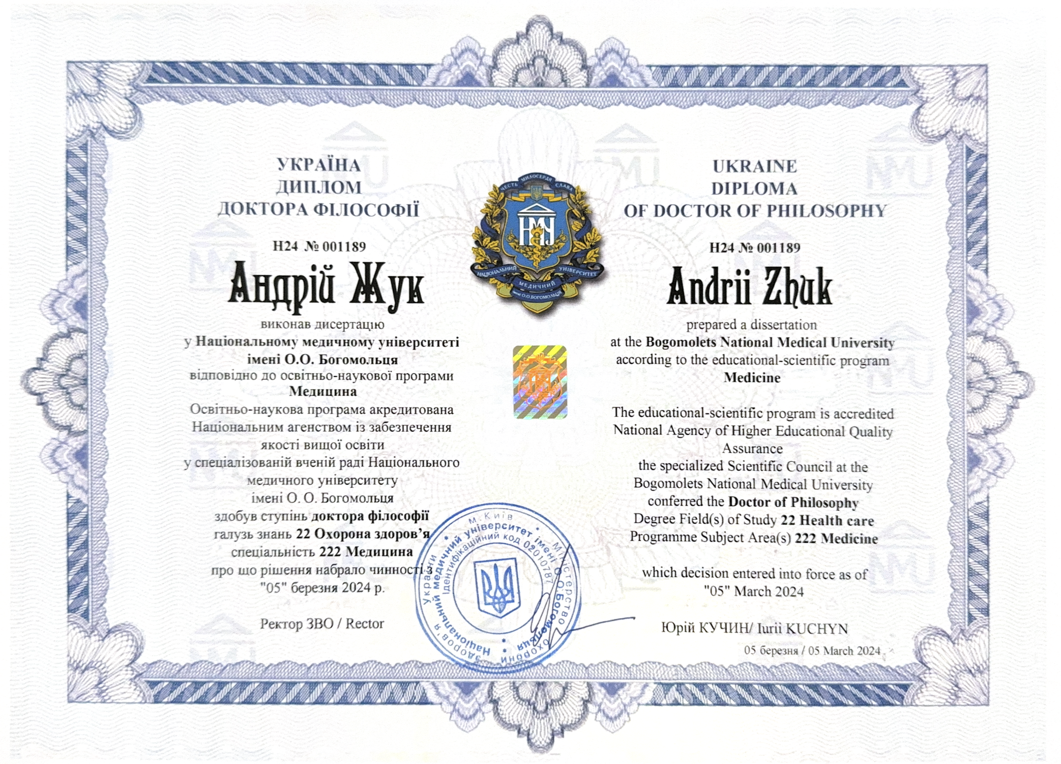 - Доктор філософії (PhD) у галузі медицини (2024): дисертація присвячена моделюванню зорових функцій після лікування регматогенного відшарування сітківки.
